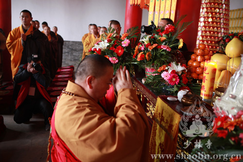 【嵩山少林寺武僧团培训基地讯】2014年11月26日,农历十月初五,为中国禅宗初祖达摩祖师诞辰纪念日,少林寺下院——三门峡熊耳山空相寺举行第十三届达摩祖师纪念大典。河南省佛教协会会长、少林寺方丈释永信法师,河南省佛教协会副会长昌明法师,陕西终南山净业寺住持本如法师,熊耳山空相寺住持延慈法师,许昌龙化寺住持延宣法师,焦作石佛寺住持恒忏法师,荥阳周古寺住持延阔法师,以及日本东京灵云院则竹秀南长老,台湾十方禅院开化长老,香港达摩学会延竹法师等高僧大德出席庆典仪式。出席纪念大典的领导及嘉宾有:河南省委统战部副部长张利芳,河南省委统战部胡宝新处长,河南省宗教局一处副处长靖锐,河南省佛教协会秘书长马占国,三门峡市委常委、统战部长张建峰,三门峡市委统战部副部长薛建峡,三门峡市宗教局副局长申春生,陕县副县长葛海水,陕县统战部长杨玉秋,陕县政协主席骆玉峰等。