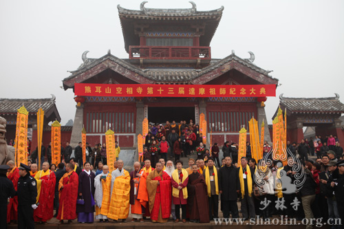 【嵩山少林寺武僧团培训基地讯】2014年11月26日,农历十月初五,为中国禅宗初祖达摩祖师诞辰纪念日,少林寺下院——三门峡熊耳山空相寺举行第十三届达摩祖师纪念大典。河南省佛教协会会长、少林寺方丈释永信法师,河南省佛教协会副会长昌明法师,陕西终南山净业寺住持本如法师,熊耳山空相寺住持延慈法师,许昌龙化寺住持延宣法师,焦作石佛寺住持恒忏法师,荥阳周古寺住持延阔法师,以及日本东京灵云院则竹秀南长老,台湾十方禅院开化长老,香港达摩学会延竹法师等高僧大德出席庆典仪式。出席纪念大典的领导及嘉宾有:河南省委统战部副部长张利芳,河南省委统战部胡宝新处长,河南省宗教局一处副处长靖锐,河南省佛教协会秘书长马占国,三门峡市委常委、统战部长张建峰,三门峡市委统战部副部长薛建峡,三门峡市宗教局副局长申春生,陕县副县长葛海水,陕县统战部长杨玉秋,陕县政协主席骆玉峰等。