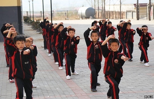 图:少林弘武中等专业学校学员的日常训练 1.压腿:正压腿,侧压腿,劈叉,撕腿。(拉伸韧带)