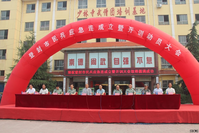 在庄严地《中国人民解放军军歌》声中,会议拉开了序幕。在登封市人武部领导宣读成立登封市民兵应急连命令和应急连干部任职命令后,我校民兵连负责人庄严地从部队首长手中接过上书“登封市民兵应急连”的旗帜,由我校散打系200余名队员组成的登封市民兵应急连正式成立,全体队员精神振奋,斗志高昂,宣誓为社会安定、为保护人民生命财产安全奉献自己的一切!民兵连成立后,将按照实战标准,针对动员集结、快速机动、展开行动等科目进行有关强化训练。